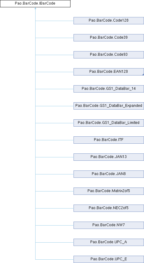 Pao.BarCode.Code128, Pao.BarCode.Code39, Pao.BarCode.Code93, Pao.BarCode.EAN128, Pao.BarCode.GS1_DataBar_14, Pao.BarCode.GS1_DataBar_Expanded, Pao.BarCode.GS1_DataBar_Limited, Pao.BarCode.ITF, Pao.BarCode.JAN13, Pao.BarCode.JAN8, Pao.BarCode.Matrix2of5, Pao.BarCode.NEC2of5, Pao.BarCode.NW7, Pao.BarCode.UPC_A, Pao.BarCode.UPC_E (計15項目)で実装されています。